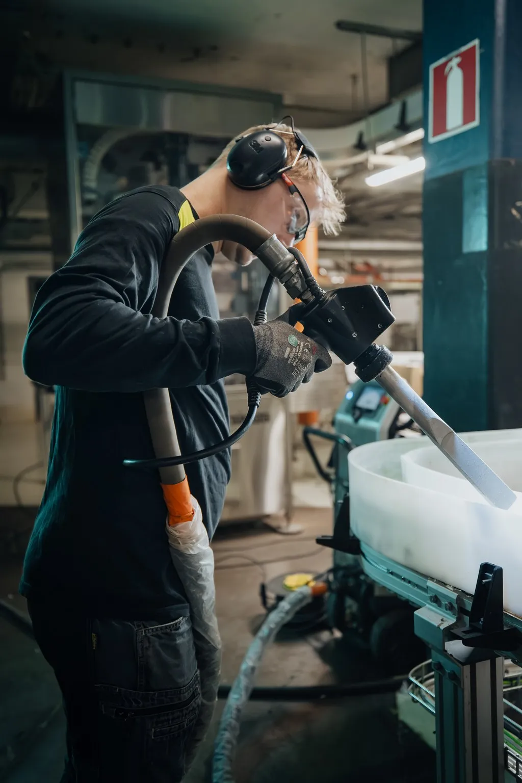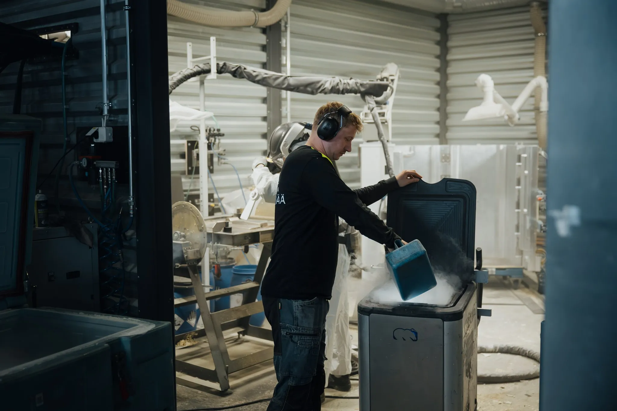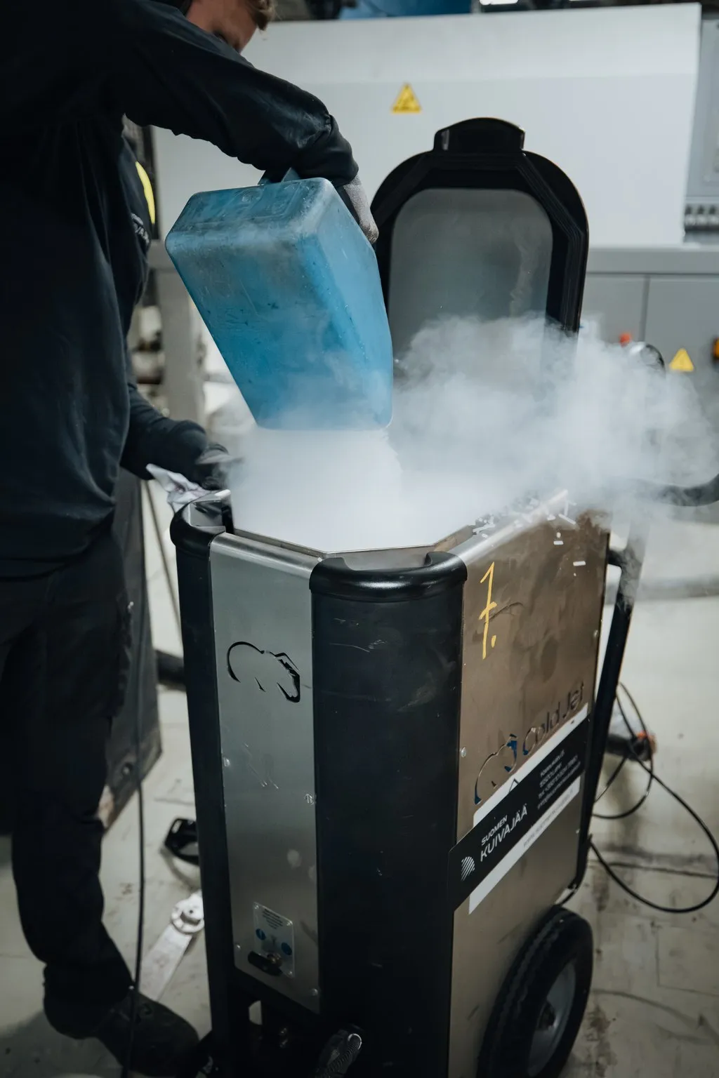 Raisiossa kuvasimme ohjattuja tilanteita, joissa työntekijät kävivät läpi kuivajääkaluston valmistelua. Kohteena oli alumiinimuotti, jonka puhdistusprosessi dokumentoitiin vaihe vaiheelta. Otimme myös ennen–jälkeen -kuvia ja -videoita, jotka havainnollistivat työn tehokkuutta konkreettisesti.