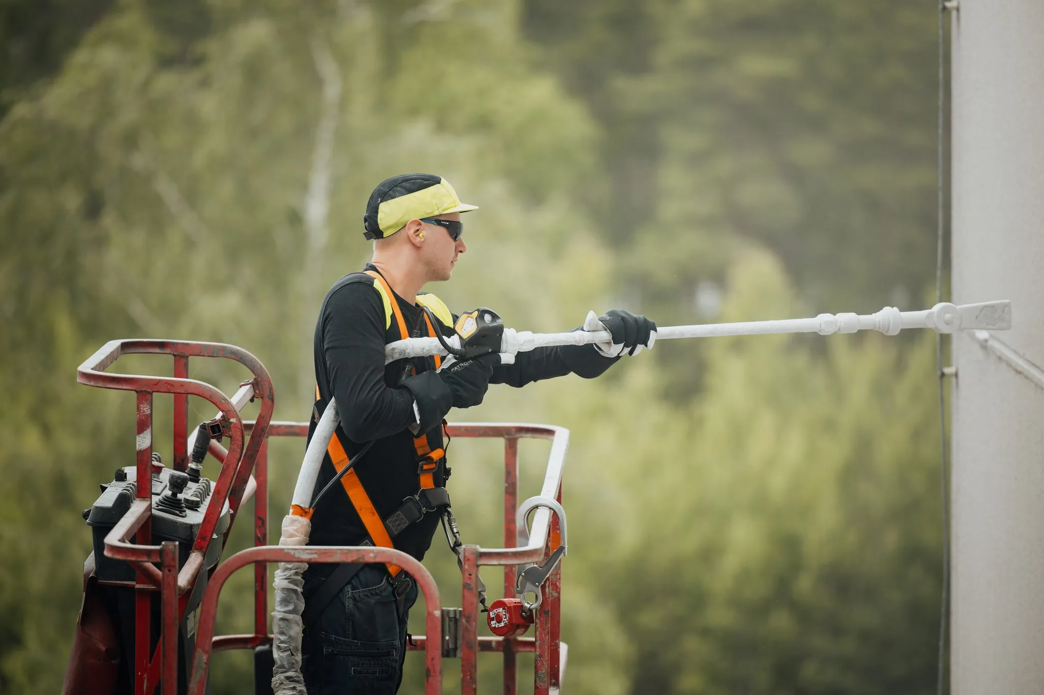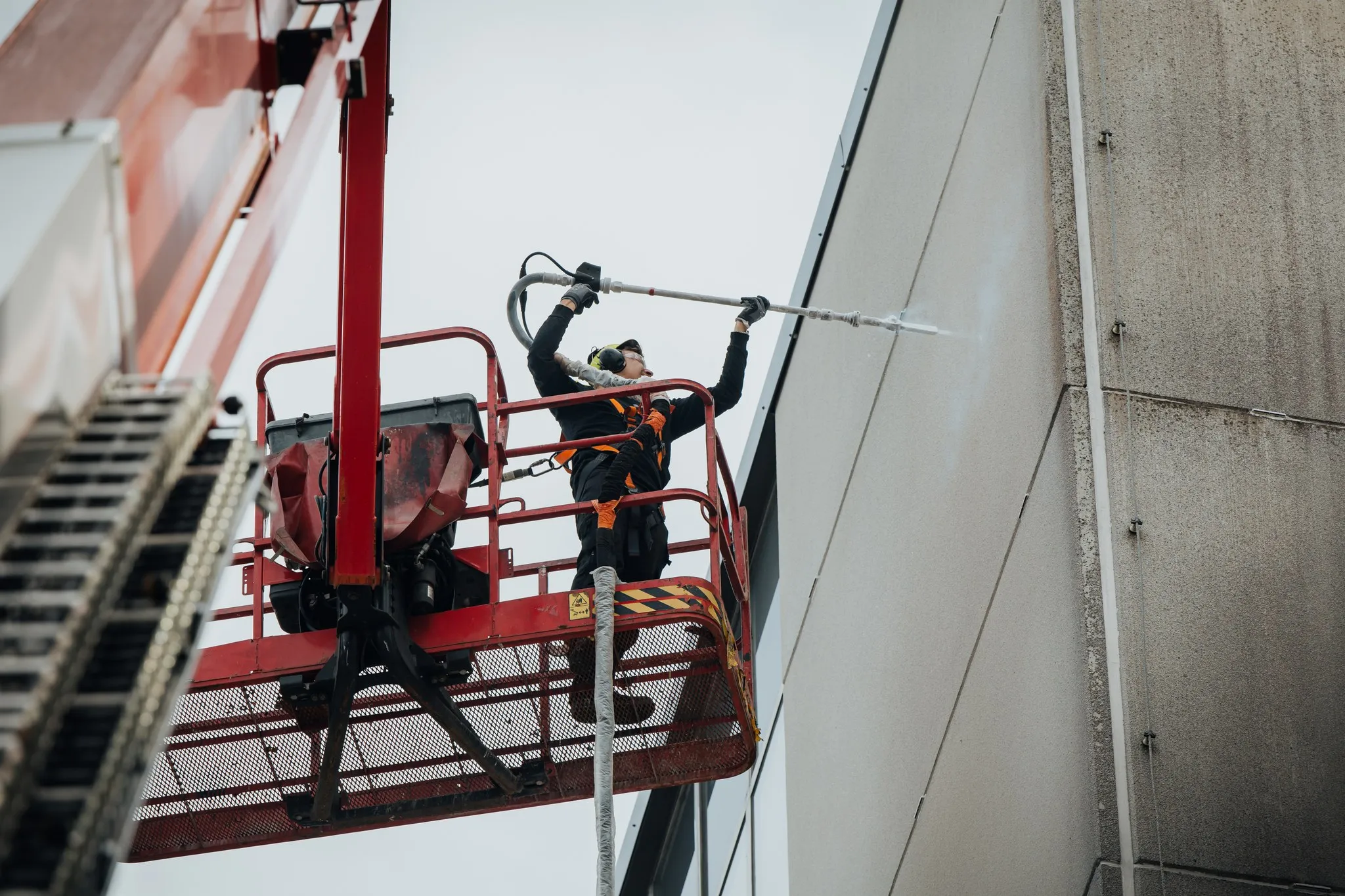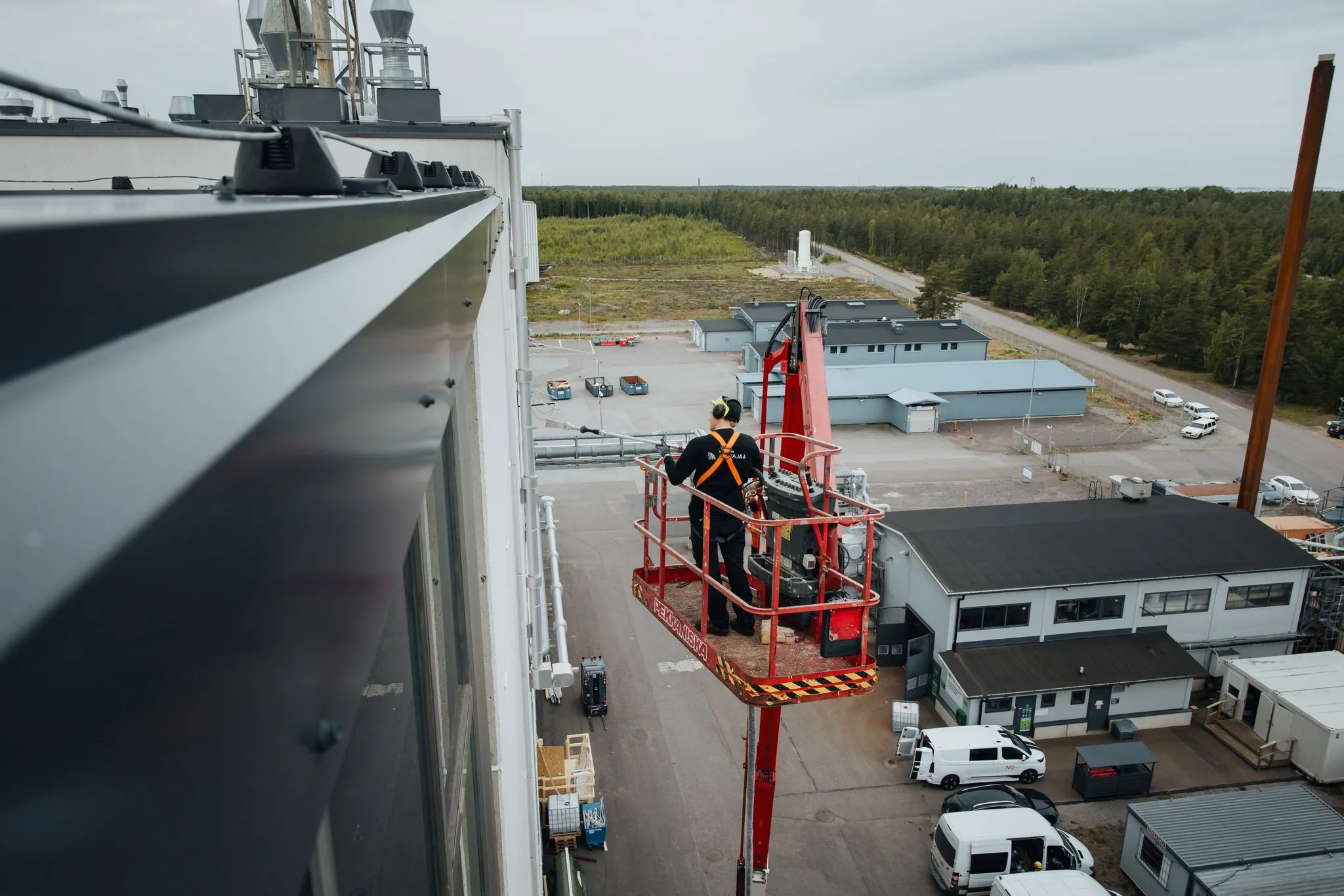 Hangossa pääsimme kuvaamaan nosturilla työskenteleviä kuivajääpuhaltajia, jotka puhdistivat ulkoseinää 15 metrin korkeudessa. Hyödynsimme DJI Inspire 2 – ja Mini 4 pro droneja, jotta saimme näyttäviä ilmakuvia sekä yksityiskohtaisia otoksia turvallisuutta unohtamatta. Mukana oli myös action-kameroita ja still-kuvausta tehtaan katolta käsin.